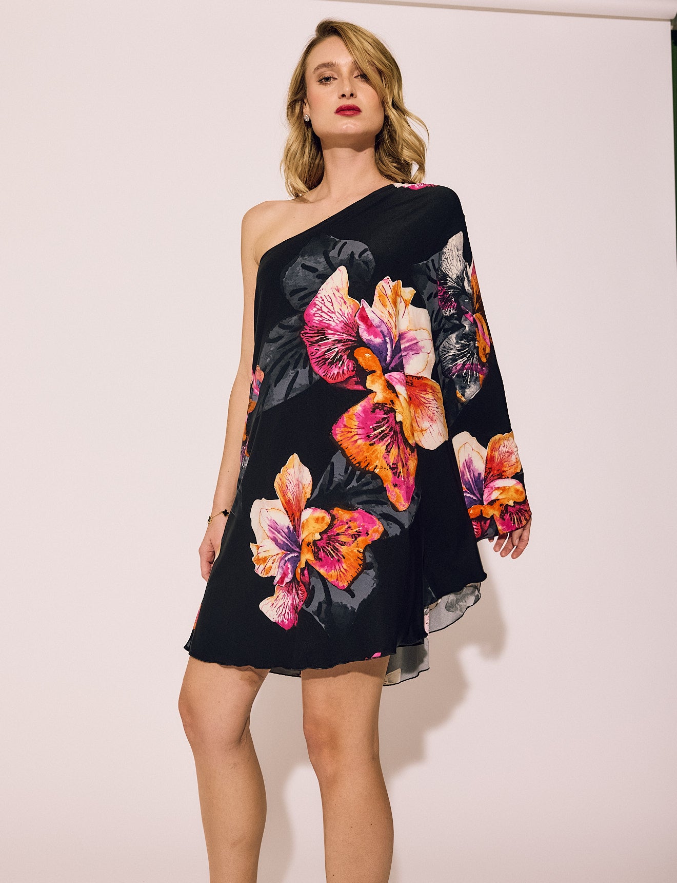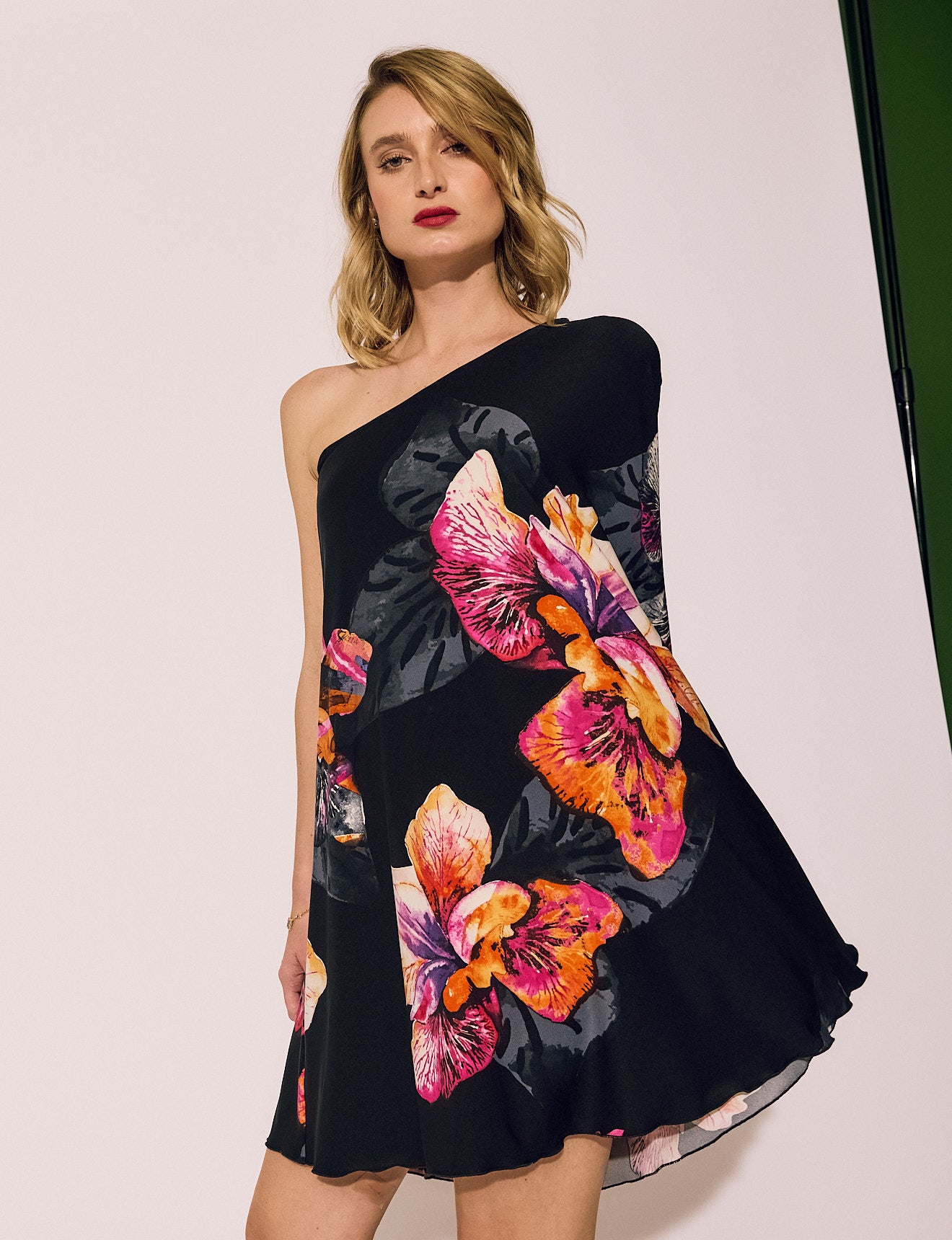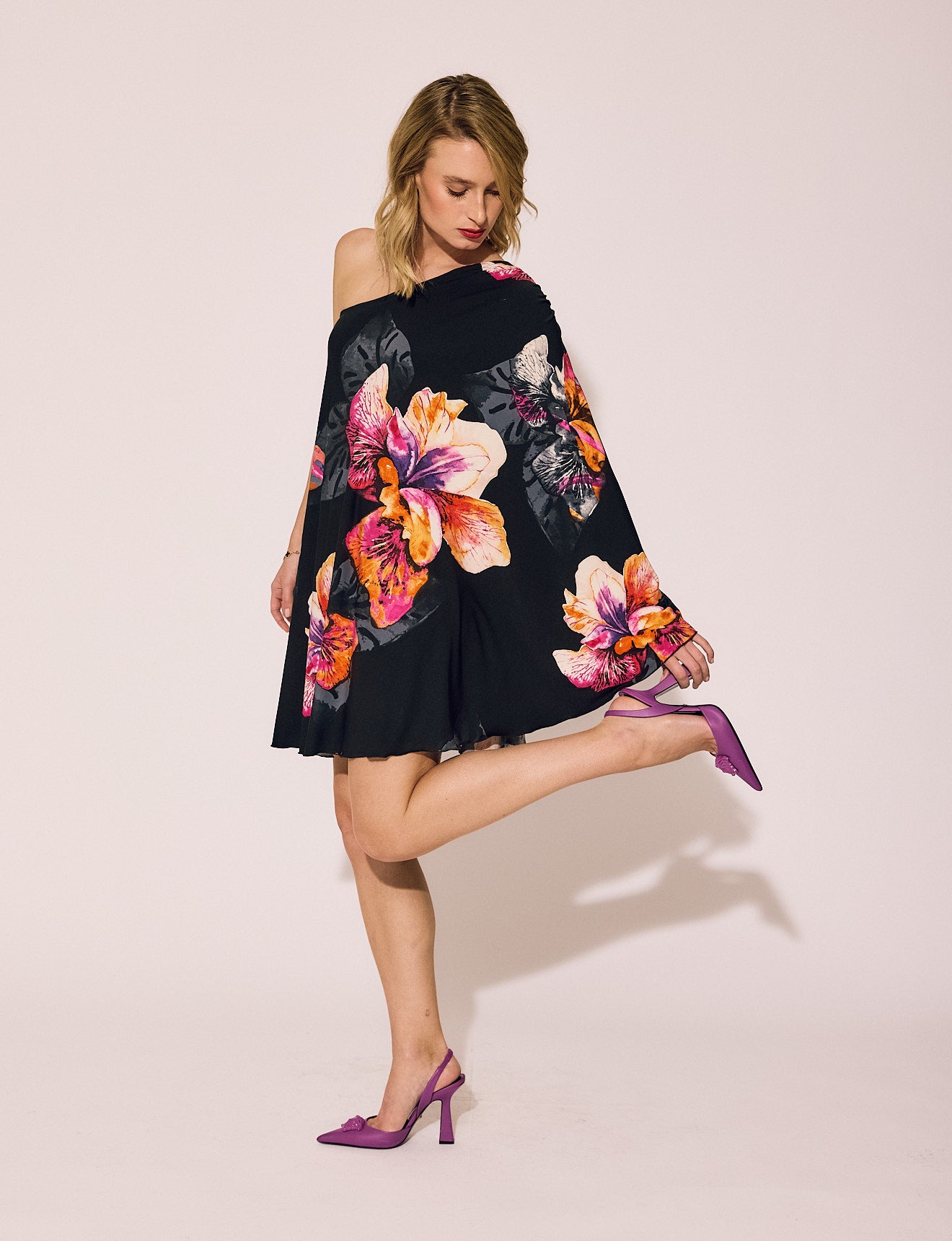 The Showgirl Floral print blooms against a deep black ground—bold, expressive, and unmistakably joyful. A dramatic sleeve adds fluid movement, while the clean hemline keeps the look refined and wearable.