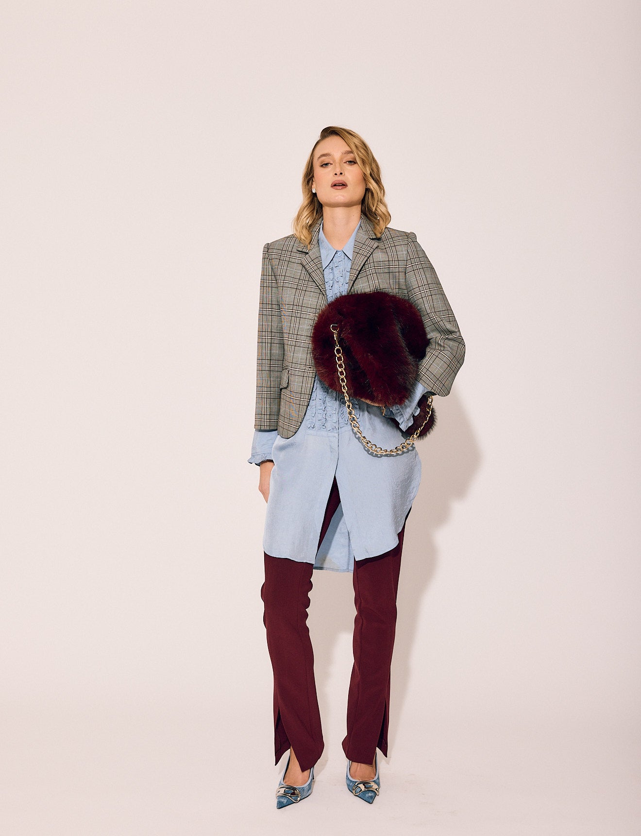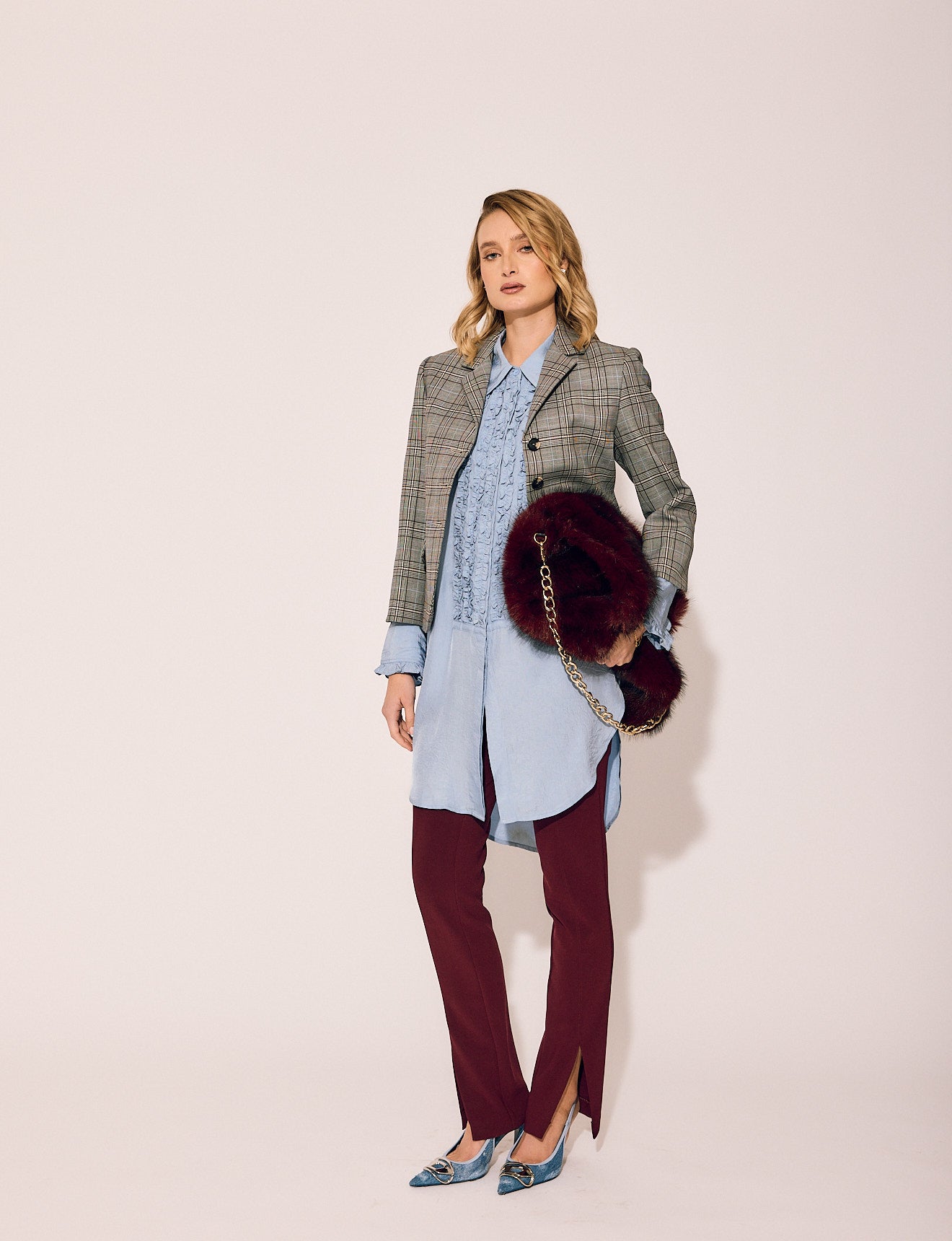 In a rich, moody wine hue, the silhouette is clean and commanding—with a subtle flare, front-facing slits, and lines that elongate. Whether you’re making power moves or dinner plans, the Ally Pant is your not-so-basic essential with elevated edge.