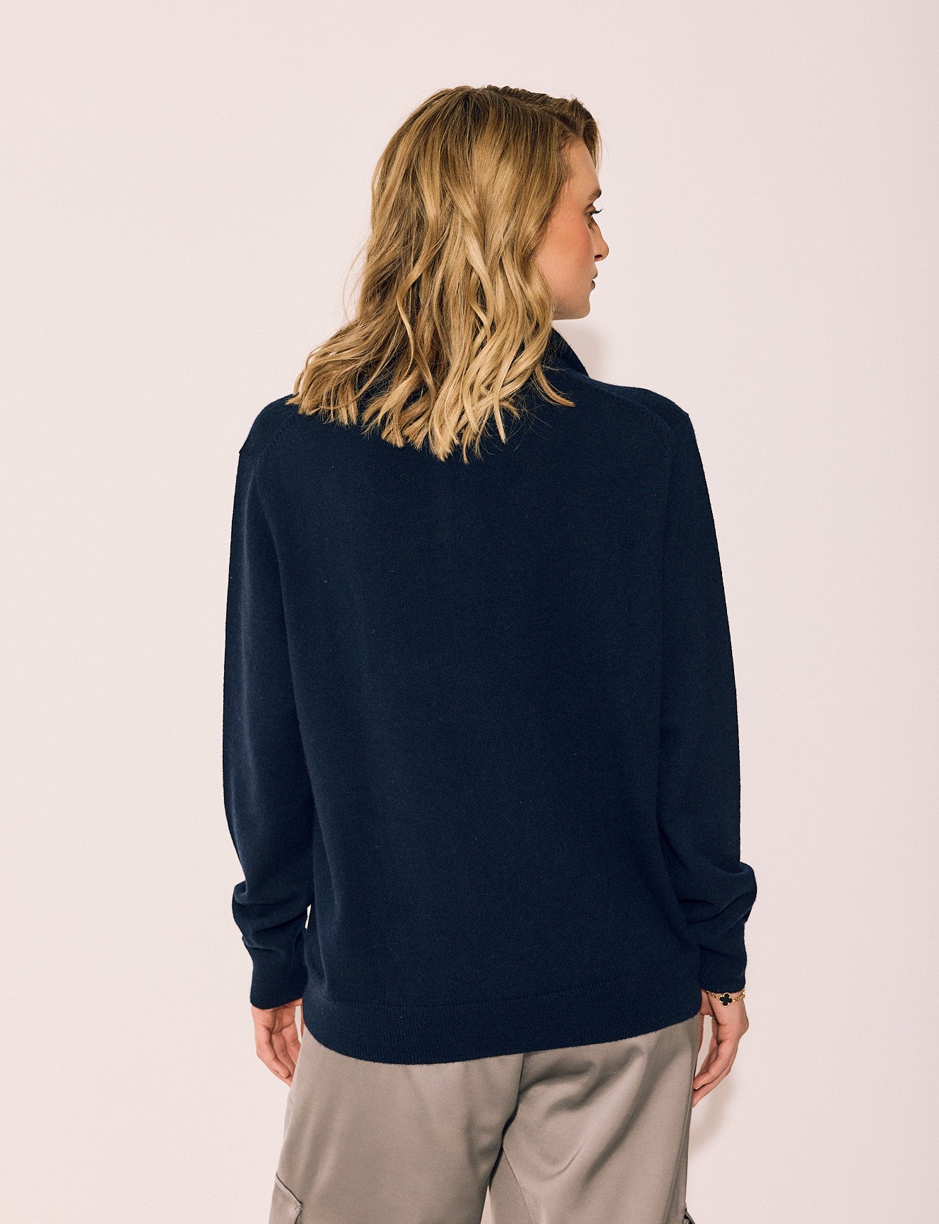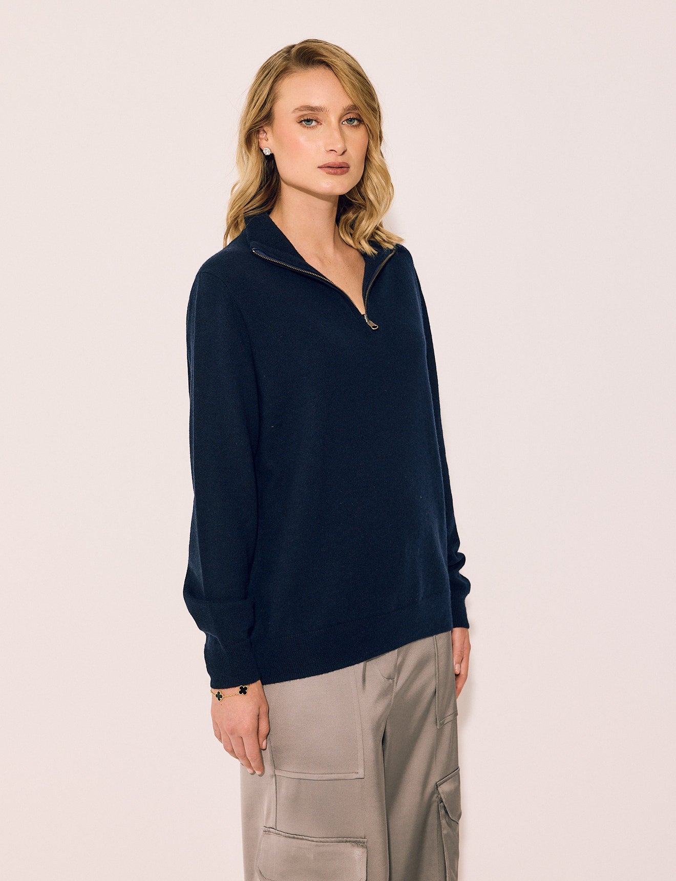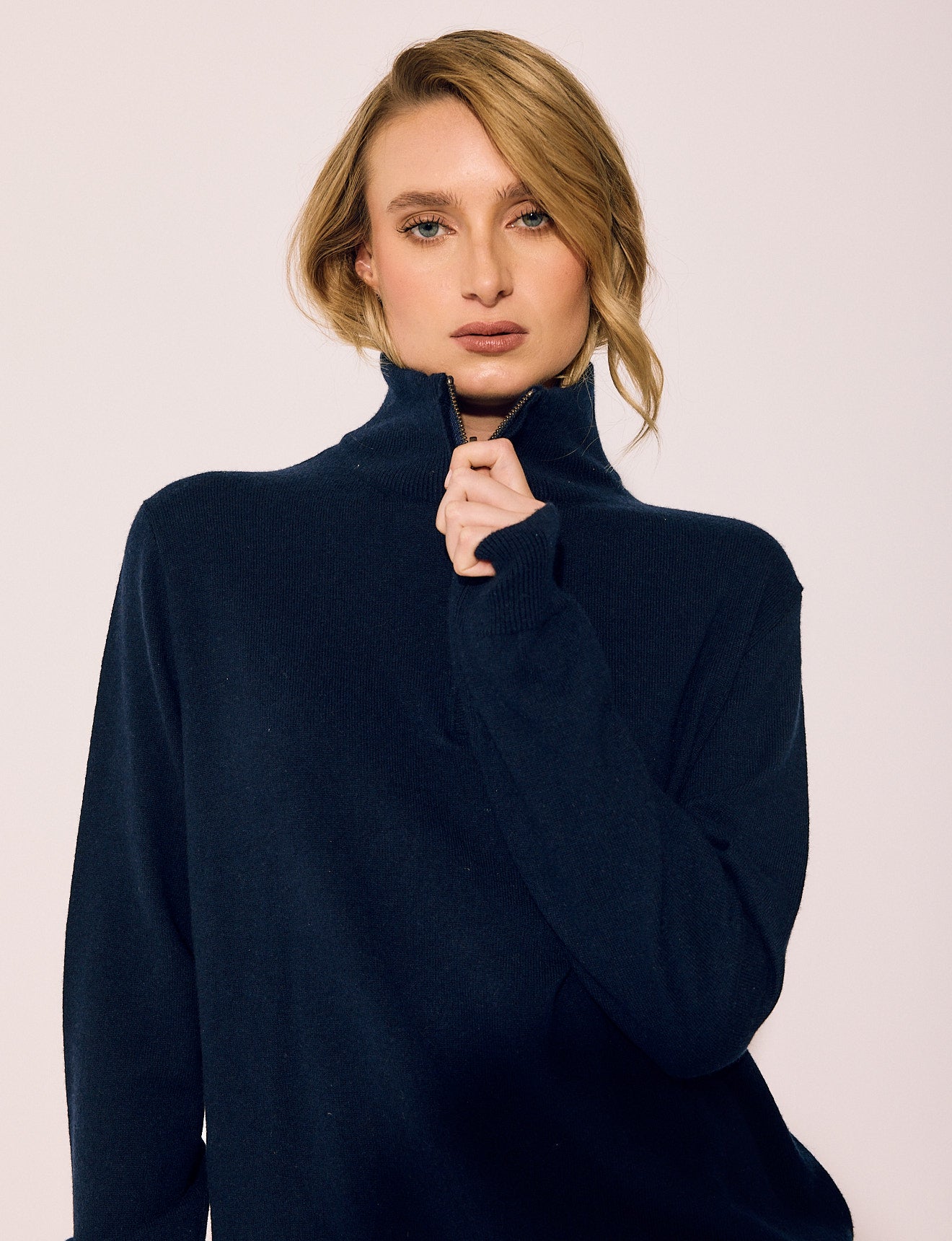 A fine-gauge wool-cashmere quarter-zip in a tailored unisex fit. Lightweight enough to layer under suiting, substantial enough to wear alone. The quarter-zip neckline styles open for ease or zipped for structure. This is the piece she reaches for repeatedly — and never has to think about.